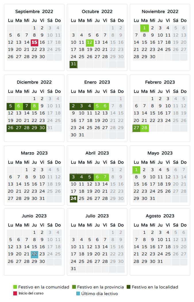 El calendario escolar de nuestro centro para el curso 2022-23 es el siguiente.