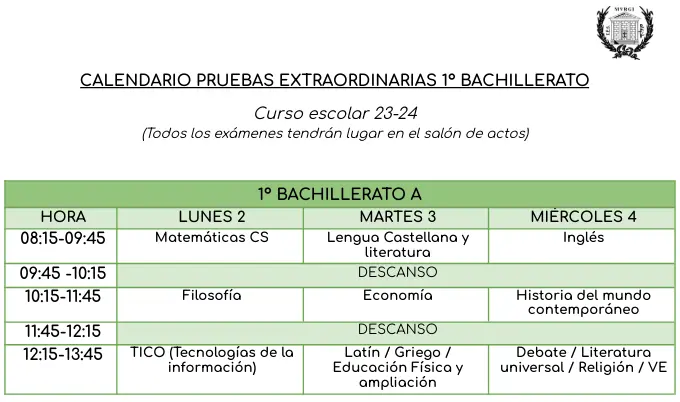 Pueden ver la fecha de las pruebas extraordinarias de septiembre de 1º de Bachillerato del curso 2023/24 en el siguiente documento.