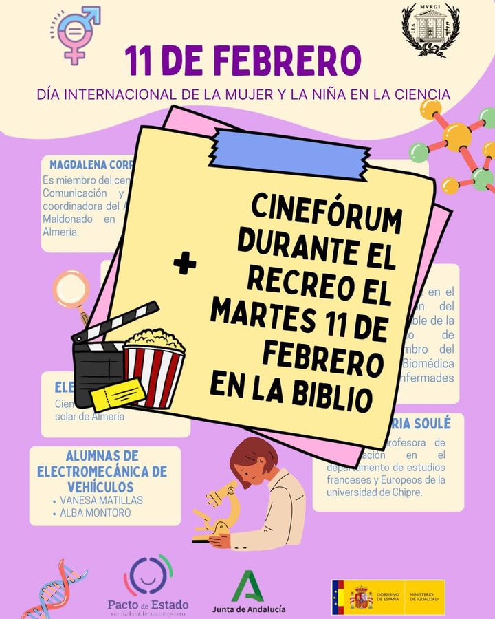 Durante estos días, estaremos celebrando el día internacional de la mujer y la niña en la ciencia en nuestro centro. Se llevarán a cabo diferentes charlas con magníficas investigadoras. Además, os esperamos el martes 11 de febrero con un cinefórum sobre este tema.