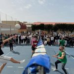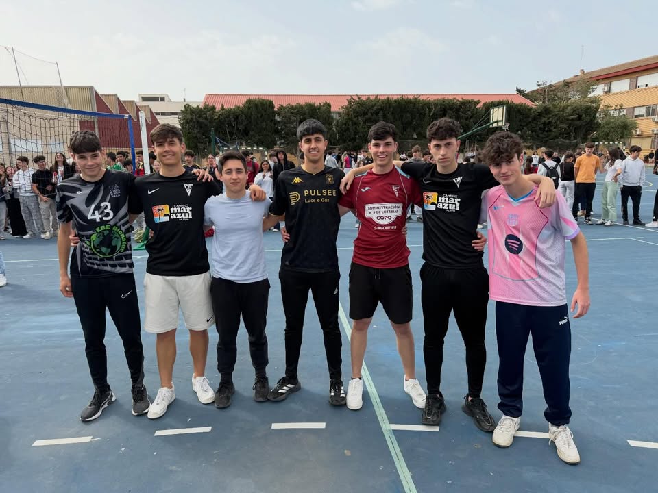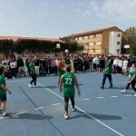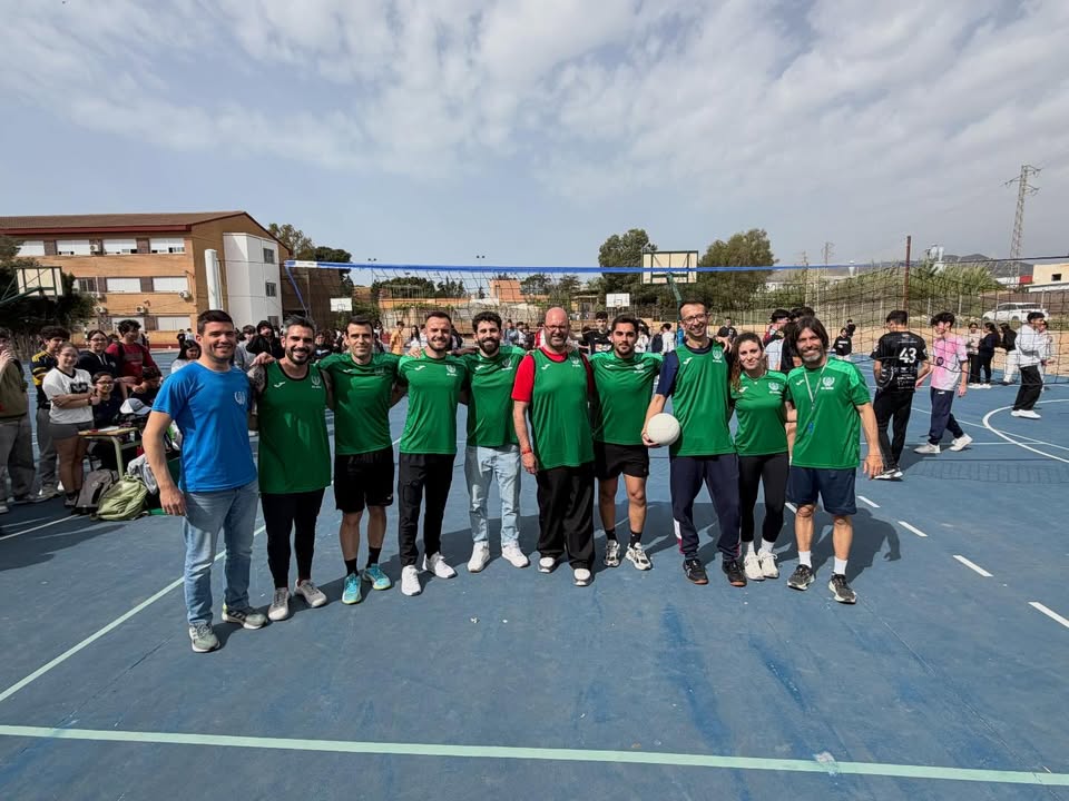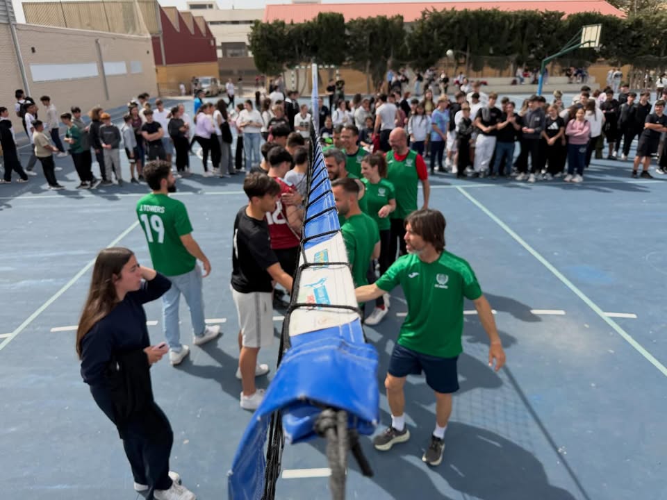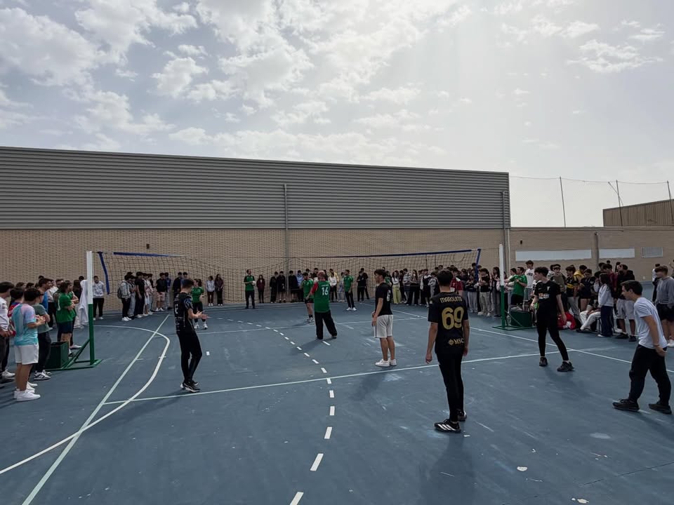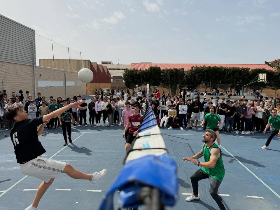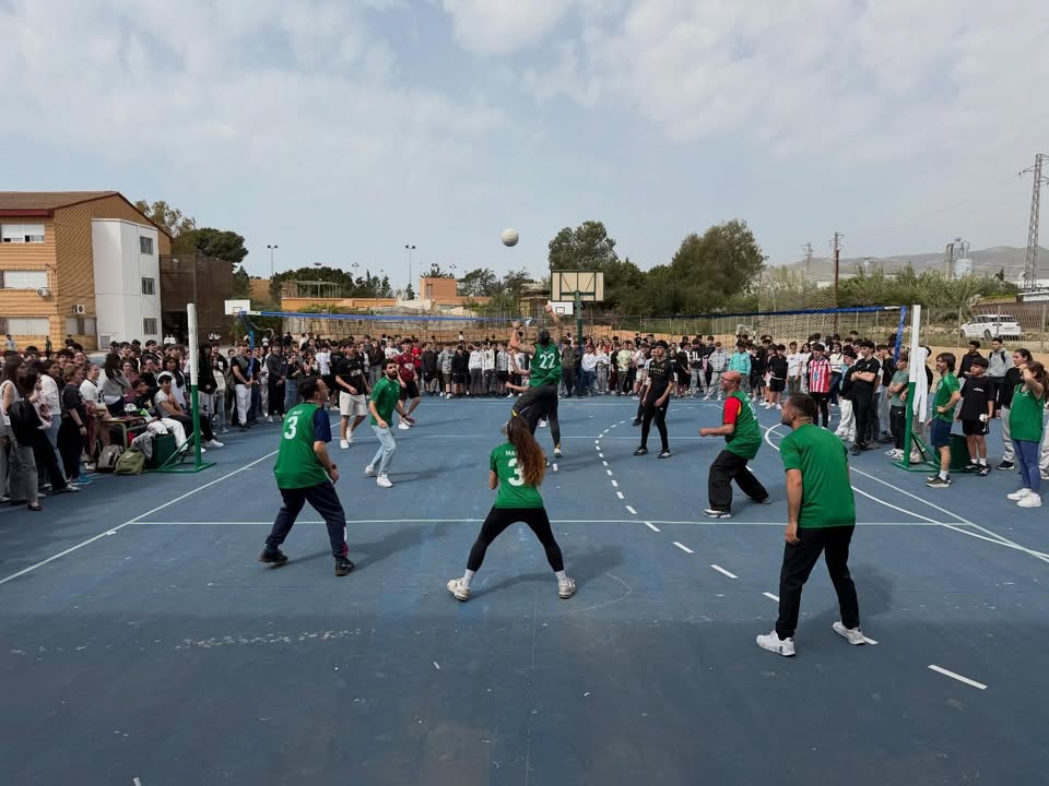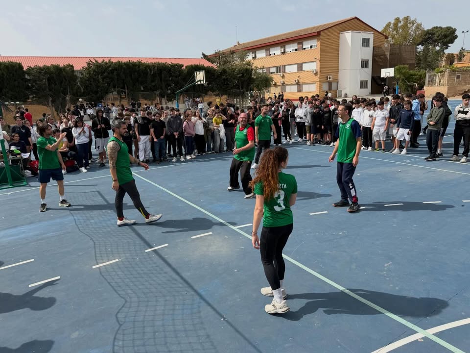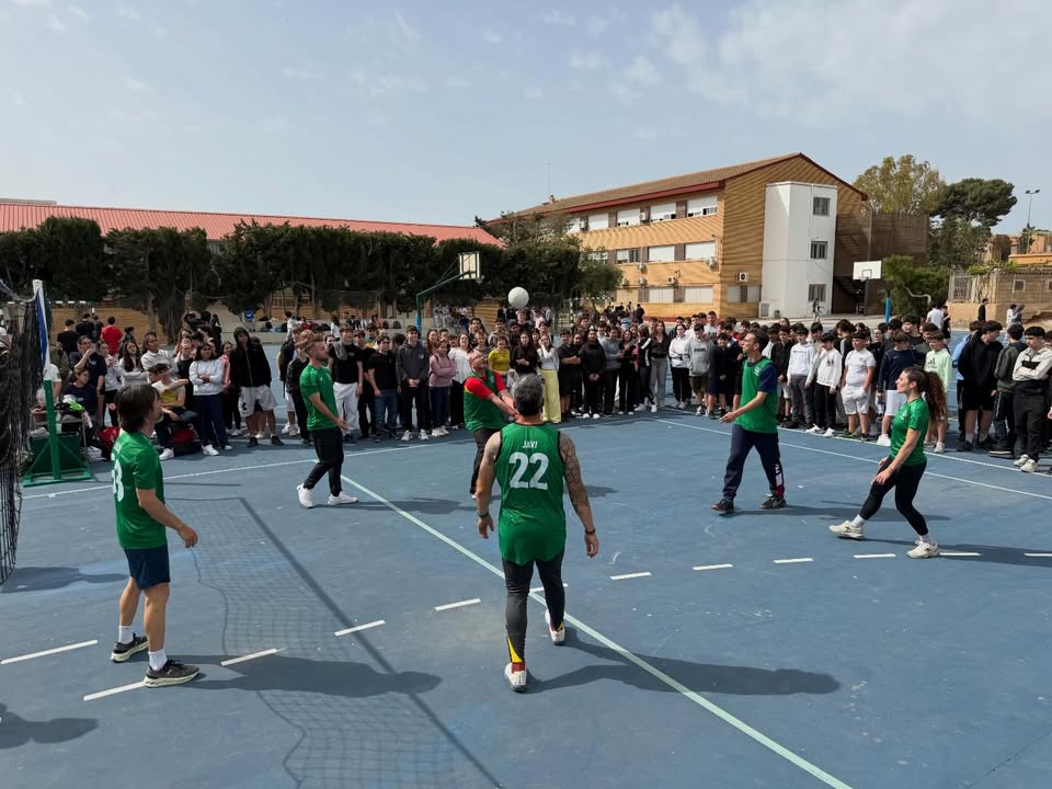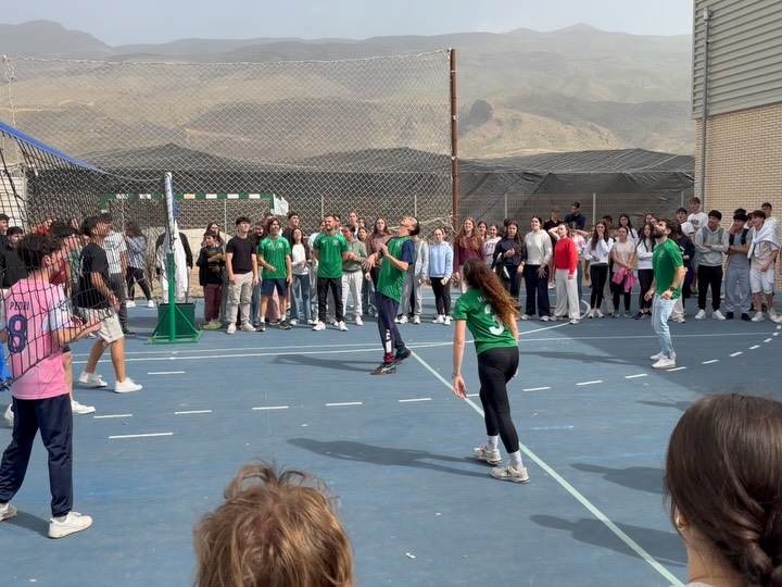 Partido de voleibol de profesores y profesoras contra el equipo campeón del torneo del alumnado 1 Bachll D 🏐. Durante el recreo de hoy todo el instituto ha disfrutado de semejante espectáculo. La semana que viene: Baloncesto ⛹️♂️ y Fútbol ⚽️