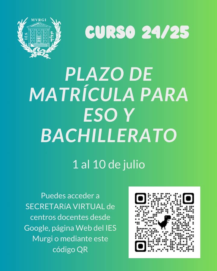 Mañana comienza el plazo de matriculación para alumnado de ESO y Bachillerato de nuestro centro y nuevo alumnado admitido. Cumplimenta tu matrícula de forma telemática lo antes posible de forma rápida y sencilla en Secretaría Virtual de centros docentes de la Junta de Andalucía. Si tienes algún problema con la instancia, acércate al instituto.