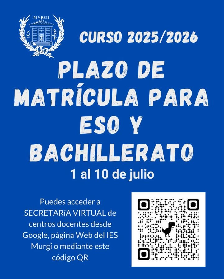 Desde hoy hasta el 10 de julio está abierto el plazo de matriculación para ESO y Bachillerato. Puedes formalizarla telemáticamente en la página de la Secretaría Virtual de la Junta de Andalucía o en el mismo centro. ¡¡No lo dejes para mañana!!