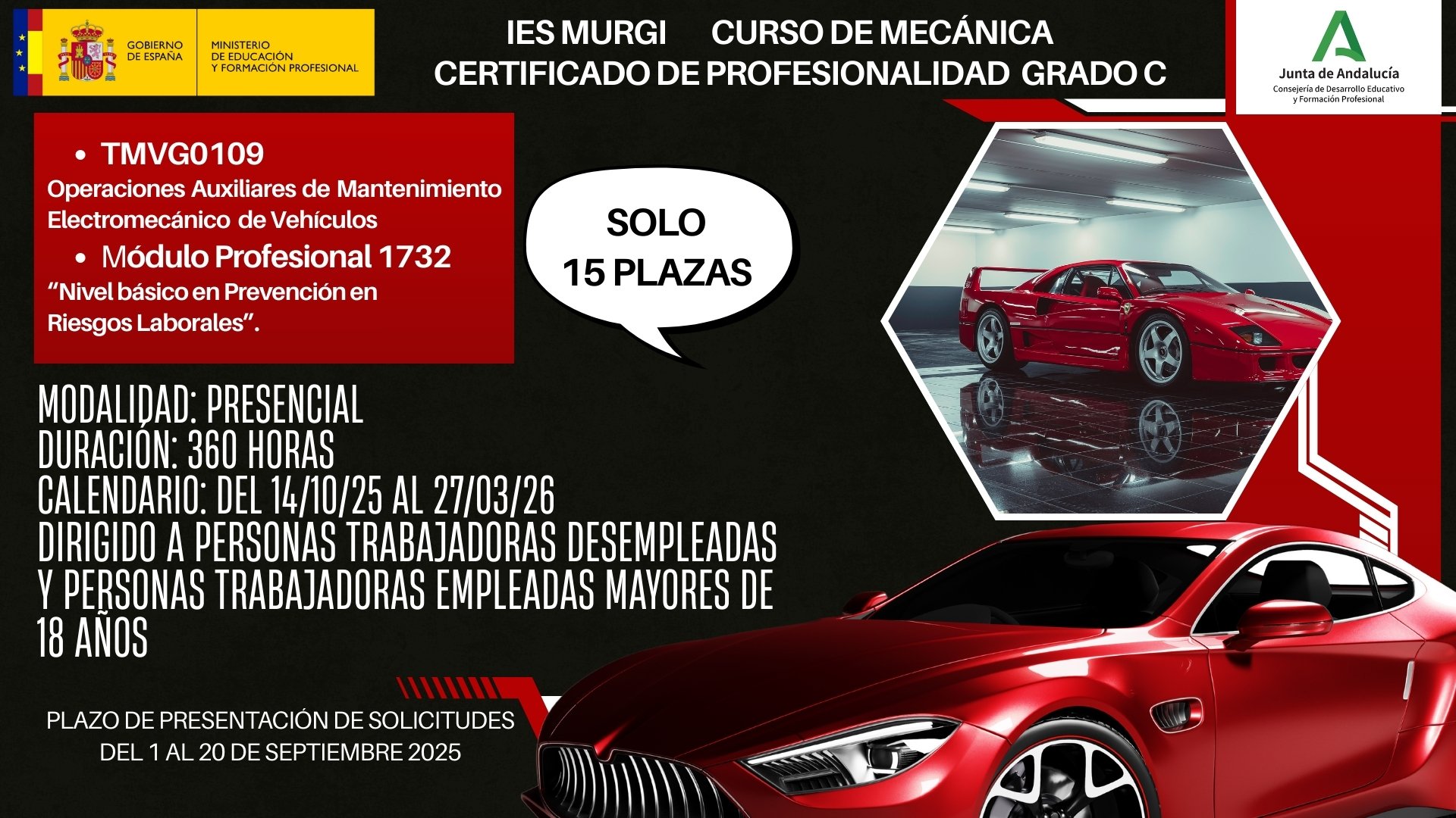 ¿Quieres formarte en el sector de la mecánica de vehículos y mejorar tus oportunidades laborales?El IES Murgi pone en marcha un nuevo Curso de Mecánica – Certificado de Profesionalidad Grado C, con titulación oficial y formación práctica adaptada a las necesidades actuales del mercado. Durante 360 horas presenciales, aprenderás a realizar operaciones auxiliares de mantenimiento […]