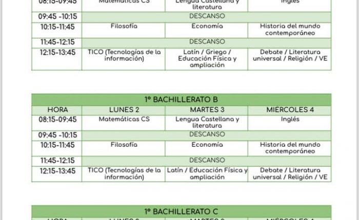 Calendario y horario de las pruebas extraordinarias de septiembre de 1 Bachillerato